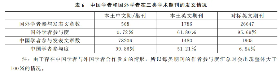 总体来看,本土英文期刊所提供的学术知识生产和传播平台已经在一定程度上吸引了国外学术共同体参与讨论;然而,中国学者在对标英文期刊上参与高水平学术讨论的程度相对较低。